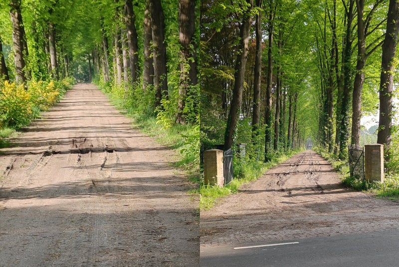 Foto's van de Laan in het voorjaar, links vanaf de Hoeve Arbeidslust, rechts vanaf de Ollandseweg.